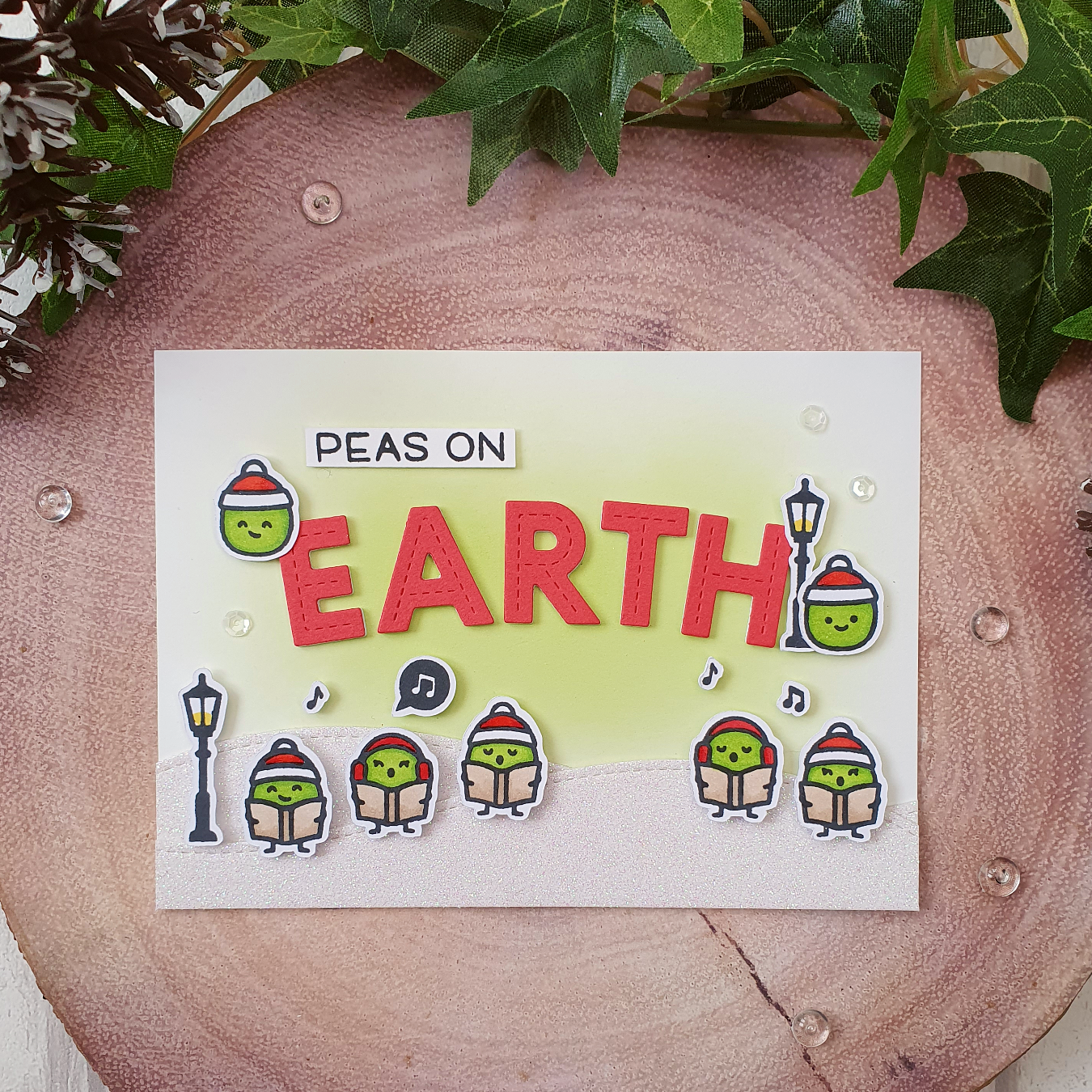 Apologies for the rubbish lighting that's the down side for autumn weather! For this card I used Lawn Fawn Peas On Earth Stamp Set. I coloured them all with Copics and cut them out. I gently blended a small amount of Mowed Lawn & Twisted Citron Distress Oxide Ink. I die cut letters to spell earth using Lawn Fawn Olivers ABCS Die. I used Lawn Fawn Hillside Borders Die to create the snow hills along with some glitter card. I added a stamped sentiment from the same stamp set and a few sequins to finish.